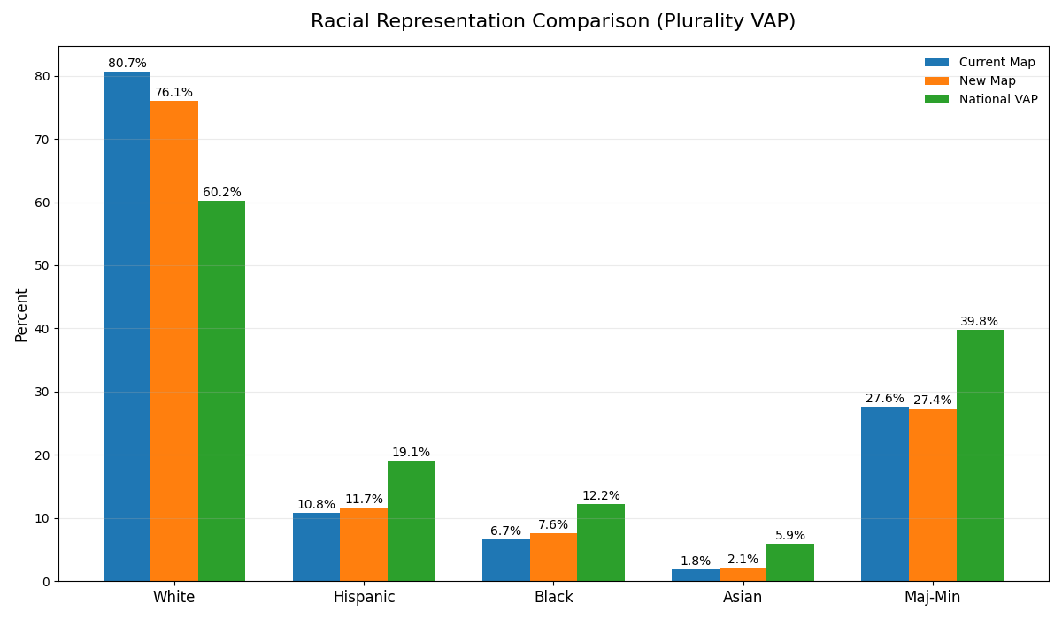 Given that the nation is 60% white voting age population (VAP), and races do not perfectly sort within precinct boundaries, it is impossible by definition for seat representation to exactly match national VAP. As a result, redistricting is not a question of perfectly reproducing population shares, but of how representation is distributed—whether minority voters are concentrated into a smaller number of districts or spread across a broader set of districts where they may exert influence. These statistics show my map successfully increased racial minority representation (by 4.6%), not perfectly but better reflecting our actual population make-up. As shown in chapters one and two, this was done without sacrificing overall fairness and competitiveness, making it a win-win situation.